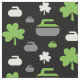 Fabric featuring a shamrock and curling rock pattern in green, white and grey on black background. Perfect for curlers and curling fans