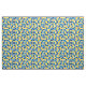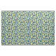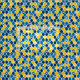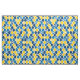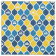 Fabric featuring an ogee tile pattern with curling rocks in shades of blue and yellow on white background. Perfect for curlers and curling fans.
