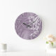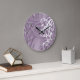 An uplifting purple pastel 10.75-inch diameter wall clock can add colour to any room sporting a white filigree and floral design coming from the upper right over a digital artwork design of shadowed swirls over a purple background. Since the numbers are a template item you can remove it. Click customise, to add text like a name or quote. This design is also available in the 8" diameter and 10.75" square sizes.