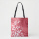 This tote features a digital artwork design of shadowed swirls over a red background with white vines and flowers. Click customise, to add text in a typeface styles, size, and colour you like.