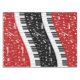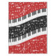 Contemporary curved piano keys and white musical notes with contrasting red and black panels
