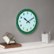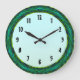 This elegant interesting wall clock features a dramatic circular abstract frame of green, blue, indigo and yellow curves around a pale turquoise centre. The numbers can be cleared if a simpler design is preferred. This pattern works best on the circular clocks.