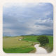 Coaster with a winding 'strada bianca' dirt road with many curves through the green fields in a landscape in Tuscany with a tree along the path and beautiful clouds in the sky leading to a destination in the distance. An analogy to reaching your goal.