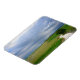 Rectangular souvenir magnet of a winding 'strada bianca' dirt road with many curves through the green fields in a landscape in Tuscany with a tree along the path and beautiful clouds in the sky leading to a destination in the distance. An analogy to reaching your goal.