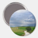 Round photo magnetof a winding 'strada bianca' dirt road with many curves through the green fields in a landscape in Tuscany with a tree along the path and beautiful clouds in the sky leading to a destination in the distance. An analogy to reaching your goal.