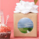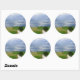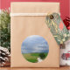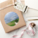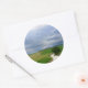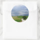 Round photo sticker of a winding 'strada bianca' dirt road with many curves through the green fields in a landscape in Tuscany with a tree along the path and beautiful clouds in the sky leading to a destination in the distance. An analogy to reaching your goal.