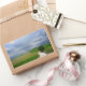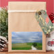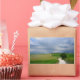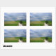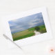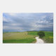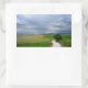 Rectangular photo sticker of a winding 'strada bianca' dirt road with many curves through the green fields in a landscape in Tuscany with a tree along the path and beautiful clouds in the sky leading to a destination in the distance. An analogy to reaching your goal.