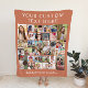 A custom terracotta photo collage keepsake blanket featuring 30 photos of family, pets, memories, events, your photography, etc. and add one or two lines of text in elegant white serif typography.