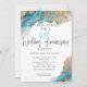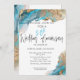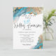 Brunch and Bubbly bridal shower invitation featuring elegant alcohol ink art and watercolour painting design in shades of teal , turquoise blue and bronze with faux gold texture, accented with handwritten style calligraphy. Use our easy to customise template to personalise with your details - a bottle of bubbly with cork popping on back Stunning Design © by WhimsicalArtwork™