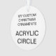 Custom printed personalised CIRCLE ROUND ACRYLIC CHRISTMAS TREE ORNAMENT DECORATION Blank Template - 3.46" high x 3.14" wide x 0.187" thick. Design, create, make your own. Your photo, image, text, logo, graphics in full colour print on both side of the ornament, using the AcryliPrint®HD printing process. Made of ultra-durable acrylic.