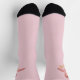 This awesome pair of patterned crew socks features a cute cartoon of a pink chick. The chick has a pale pink belly and darker pink wings and head with a yellow beak and feet. Next to the chick is a small egg.