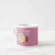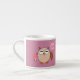 This awesome espresso mug features a cute brown owl with big sleepy eyes. The owl is holding a pretty pale pink balloon and a bouquet of bright pink flowers wrapped in a pale pink cone.