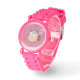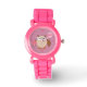This awesome watch features a cute brown owl with big sleepy eyes. The owl is holding a pretty pale pink balloon and a bouquet of bright pink flowers wrapped in a pale pink cone.
