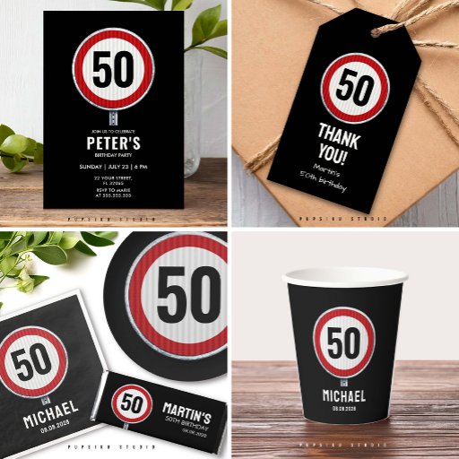 Customise your age for the perfect birthday party. Red round traffic speed sign with a modern graphic style.
