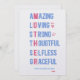 Customisable Amazing Mum Personalised Mother's Day Card. Card features nice qualitties of mum in blue and pink and how it has "mother" in it. Amazing, loving, strng, thoughtful, selfless and graceful. Custom Red Hearts Personalised mothers day Day Holiday Card. You can personalise with your name or additional text letter print on front or back.