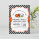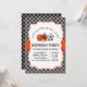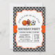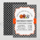 A birthday party invitation featuring all-star sport theme with black and white quatrefoil and orange red banner