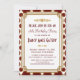 These birthday party invitations feature a burgundy, white, and gold colour palette, a geometric frame, geometric patterns, and other stylistic details all inspired by Art Deco and the roaring twenties. You can customise the sample text fields to your liking.
