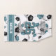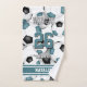 This team spirit hand towel for a soccer player features easy-to-personalise athlete name and jersey number plus team & mascot name overlying the background image of a bunch of randomly arranged teal, black and white soccer balls on a white background. The soccer balls are selectively shaded to give them a 3D appearance. The athlete's name can be personalised on horizontal teal varsity stripes at the bottom edge of the towel - by katz_d_zynes