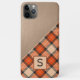 Contemporary tan beige, taupe brown, black, and autumn pumpkin orange coloured tartan plaid, and a faux leather texture pattern background. With room to customise or personalise with a name monogram or initial of your choice. Beautiful, modern, and cool cover for the trend-savvy and art-loving hip trendsetter, artsy motif lover who wants to protect their phone from dust and dirt, wear and tear. This design is available in Apple iPhone 6, 7, and 8 Plus, 10 or X, XR, XS, 11, 12, 13, 14 Mini, 15 Plus, and Pro Max cellphone cases. Show off your style, look fashionable, and feel stylish with a unique design on a mobile device accessory of your choice.