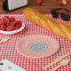 Customisable name it's a girl baby shower party plates in fun and chic peach orange pink, grey and white Moroccan quatrefoil lattice pattern.