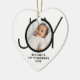 This stylish heart-shaped Baby's First Christmas Photo Ornament is decorated with the word JOY in black on a white background.