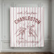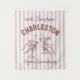 Set the vibe! Fun “With Love From” custom destination tapestry with clinking martini glasses, the perfect pastel pink striped backdrop for bachelorette photos, bridal suite décor and party keepsake.