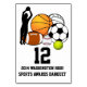 Sports event table number card done in white, with graphics of a black silhouette of a child throwing a ball, football, volleyball, soccer ball, basketball, baseball, and tennis ball. Black number and text at the bottom is ready to personalise to read what you want. Personalise the number and text, one for each table at your event. The background colour can easily be changed to any colour you want in customise mode.