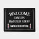 Custom barber shop doormat with red and blue barber pole sign. Personalise with your own business / company name. Black and white door mat.