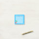 Custom Post-it notes with retro letters and fun beach or swimming pool themed art of a red beach ball, green sun umbrella, vacation sandals and suntan oil on a watery blue background with waves.