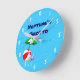 A custom clock with tropical letters and fun art of essential toys for the beach or the pool; a red beach ball, green umbrella, sandals and suntan oil on a blue background with curly waves and optional white numbers. Customise It to change fonts, colours, even save your design for later.