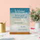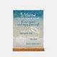 This modern and stylish acrylic pedestal sign features 'Welcome - to our beach house - be our guest and enjoy free wifi - network: - password: - enjoy your stay' in teal blue text against a beautiful sandy beach and ocean waves background. It can be personalised or customised with your own message. It's a simple, welcoming method for informing your vacation rental guests about the internet login details.