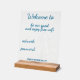 This modern and stylish acrylic pedestal sign features 'Welcome - to our beach house - be our guest and enjoy free wifi - network: - password: - enjoy your stay' in teal blue text against a transparent background. It can be personalised or customised with your own message. It's a simple, welcoming method for informing your vacation rental guests about the internet login details.