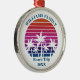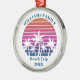 Cool custom beach sunset keepsake ornament for a destination wedding or family trip to an island. Cute personalized bridal party presents or family reunion gifts featuring a pretty pink background in front of beautiful palm trees.