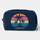 Cute custom beach sunset blue toiletry bag for a seaside vacation or family trip to the ocean. Cool personalised gift featuring tropical palm trees and pretty pink and blue with your personalised name or other text.