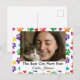Show the world who the #1 Cat Mom is with this vibrant, customizable postcard. The design features a playful border of watercolor-style paw prints and hearts in a rainbow of colors, framing your favorite photo of you and your cat.