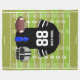 A fun sports design for the budding football star, grid iron fan or American football coach, this black and silver grey grid iron jersey can be customised with any number and name to create a unique gift or football team award. Also featured beside the football jersey is a water bottle, an American football and a grid iron helmet and the background is a marked football field with the yard lines.