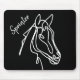 Custom black and white horse drawing mouse pad. Add your own name or quote. Modern line art drawing of farm animal. Great for school, home, office, equestrian club, derby, horse racing, horse riding event etc.