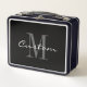 Custom black metal lunch box with elegant monogram. Elegant retro style design for kids. Personalised gift ideas for little boys and girls going to kindergarten and preschool. Classic metallic lunchbox with handle. Classy Birthday or Holiday gift idea for son, grandson, granddaughter, daughter, cousin, nephew, teacher etc. Add your own name, monogram initials or quote. Available in many colours with serious font. Cool back to school supplies with monogrammed name. Can also be used for other things like storage, party favour, prop, keepsake coffer, cash box, safe, mini suitcase etc. Custom background colour.
