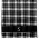 Stylish shower curtain with a chequered black and white buffalo plaid/tartan design, personalised with your monogram/initial or any text you choose.