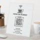 This sign serves as a way to inform customers of the password for the coffee shop's Wi-Fi network, as well as provide them with a QR code that they can scan in order to quickly connect to the network.