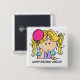 A little blonde haired girl with a pink balloon and blue and lavender shirt on a button you can customise with your choice of text, her name, and age! Perfect for all who are attending the birthday party!