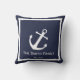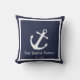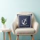 This midnight blue throw pillow has a white border and anchor. Perfect for a beach house or other nautical-themed decor. Personalise this throw pillow with your text.