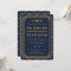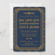 These wedding invitations feature a blue and gold colour palette, a geometric frame, geometric patterns, and other stylistic details all inspired by Art Deco and the roaring twenties. You can customise the sample text fields to your liking.