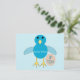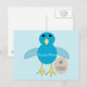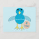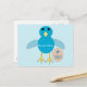This postcard features a cute cartoon of a blue chick. The chick has a pale blue belly and darker blue wings and head with a yellow beak and feet. Next to the chick is a small egg.