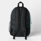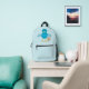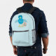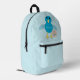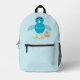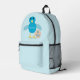 This awesome backpack features a cute cartoon of a blue chick. The chick has a pale blue belly and darker blue wings and head with a yellow beak and feet. Next to the chick is a small egg.