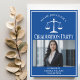 This custom blue law school graduation party invitation features white typography for a class of 2024 graduate above your student photo. Customise with your graduating year under the scales of justice and photograph for a great personalised lawyer or attorney invite.