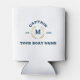 Custom modern vintage boat can cooler with cool navy blue nautical lettering reading CAPTAIN, your monogram in a printed golden laurel, and your personalised boat name. Great gift for a boating trip, your own sailboat, yacht, or boat crew.