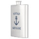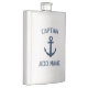 Custom boat captain name navy anchor steel flask. Personalised nautical drinking accessories with navy blue anchor and custom name or monogram initial letters. Funny maritime Birthday or Father's Day gift idea for sailor men. Make your own for skipper dad, father, grandpa, uncle, son, friend, stepfather, stepdad, grandfather, boss, friend, etc. Vintage masculine typography with ship anchor design. Customisable present with sailing / boating theme.  Also nice for cruise or sailboat crew members. Shiny metallic flask bottle with print.