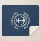 Sherpa blanket with your custom boat name and anchor with circular rope border and the text "Welcome aboard" or other custom text. White design on a dark blue background.