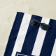 Welcome aboard! Nautical boating beach towel reading your custom boat name surrounded by a compass with an anchor on modern navy blue and white stripes with seagulls as well as a second line of text ready to be personalised. Perfect for the lake house vacation or a weekend boat trip!